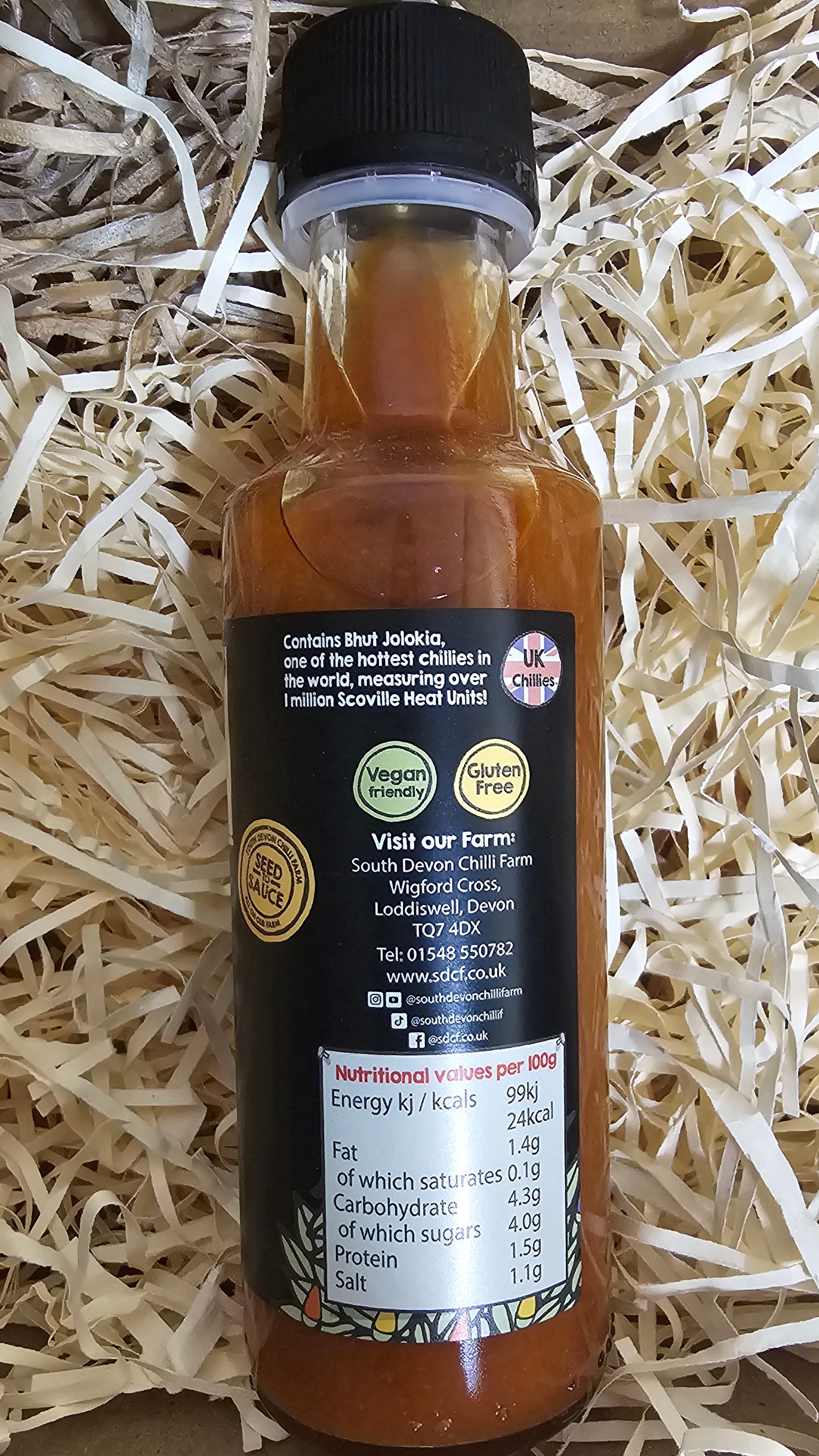 Turn up the heat with this Extreme Chilli Sauce made by the renowned South Devon Chilli Farm. Packed with fiery flavour, this sauce features the legendary Bhut Jolokia (Ghost Pepper) β one of the hottest chillies in the world, measuring over 1 million Scoville Heat Units.